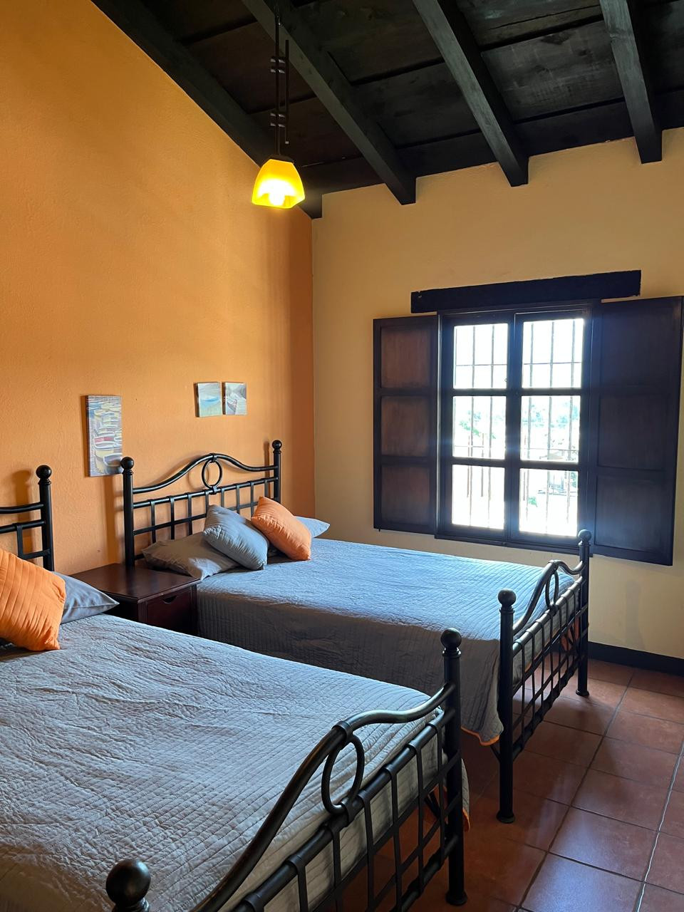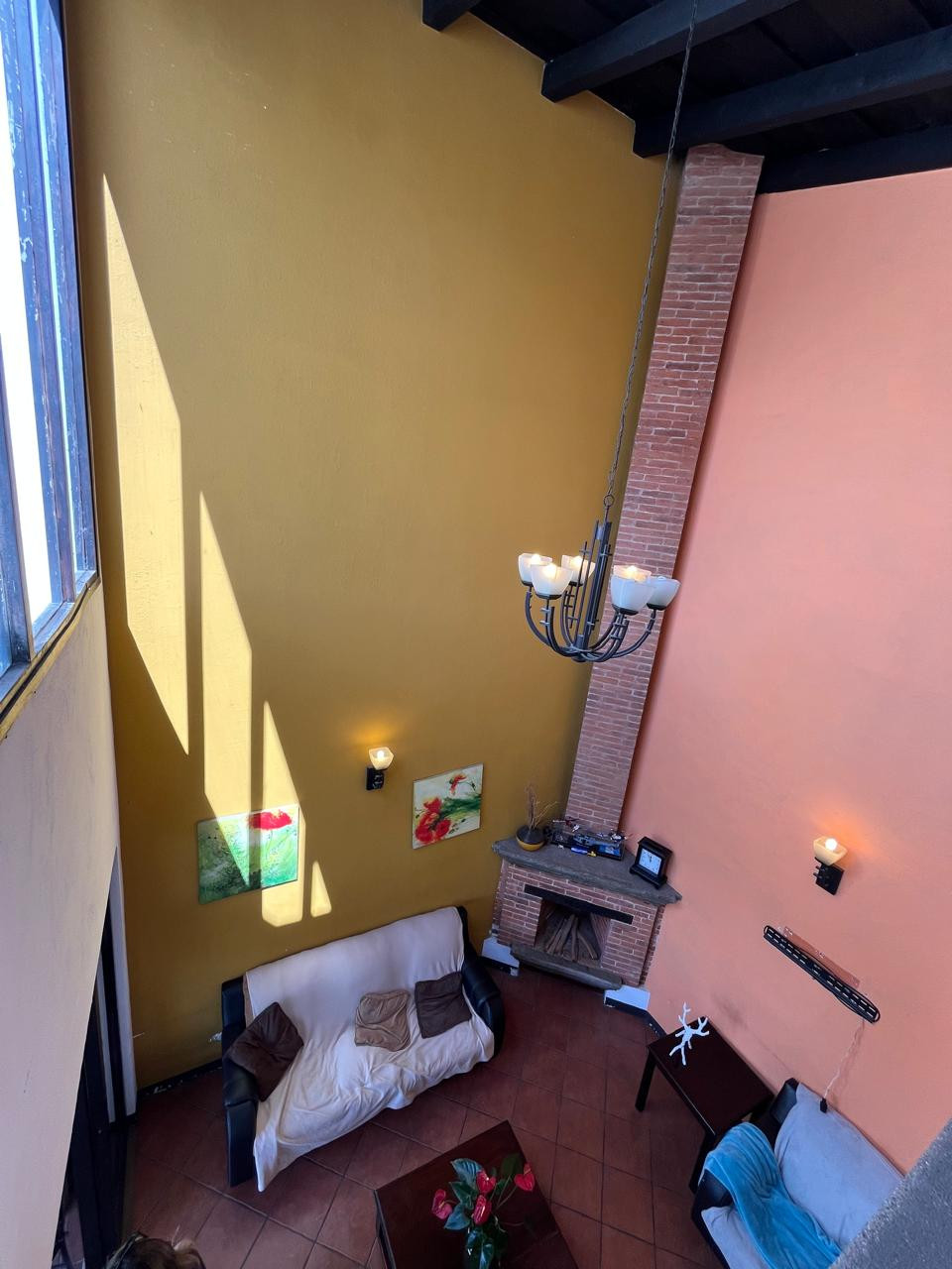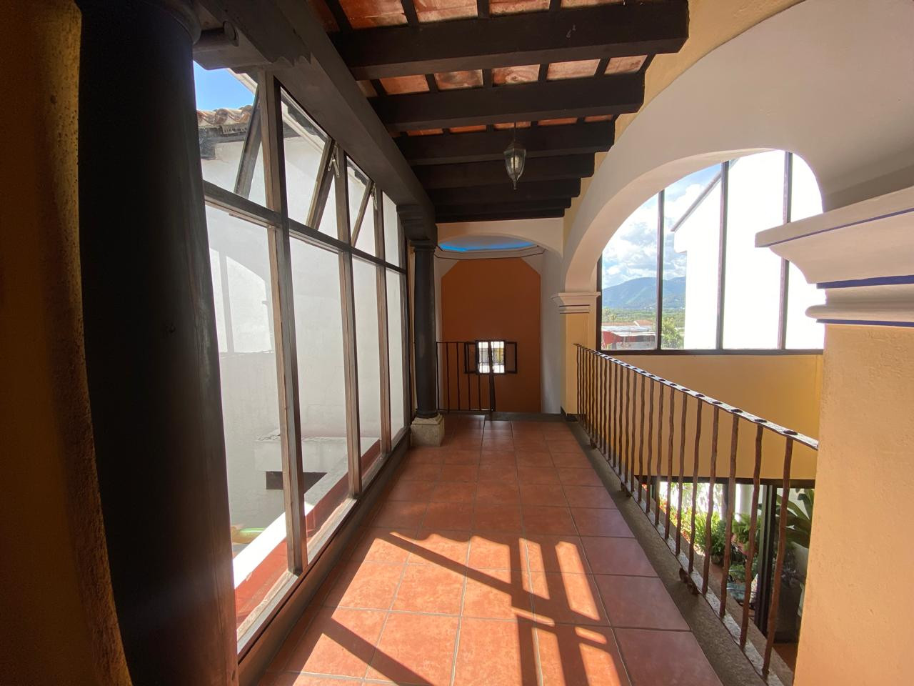 Vigas de madera, terraza estilo español, vistas a los volcanes y al cerro de la cruz.