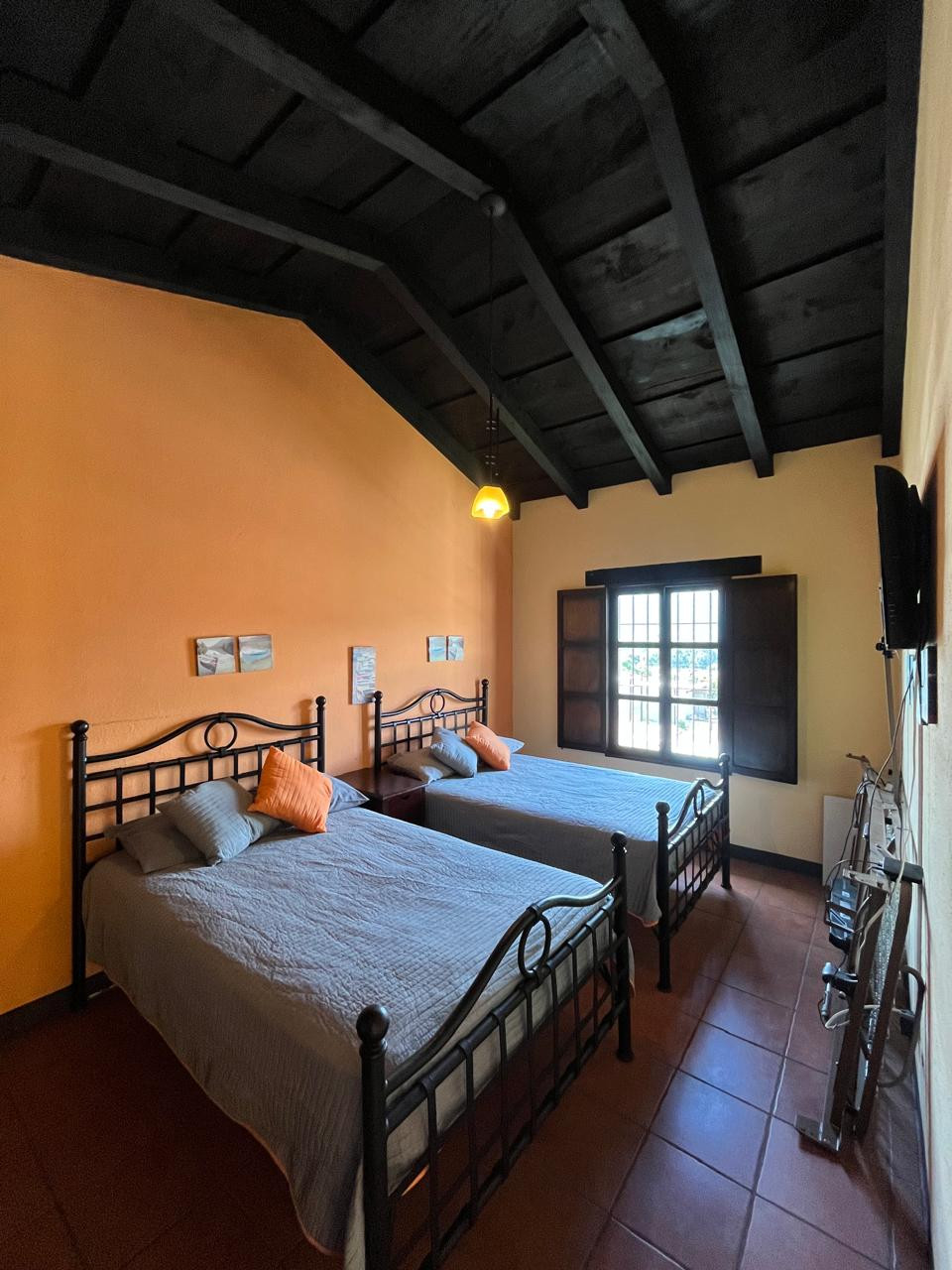 Habitación doble con camas imperiales y clóset (comparte baño completo), Habitación principal con baño y tina, Habitación con cama matrimonial y clóset, Pasillo con vista a la fuente.