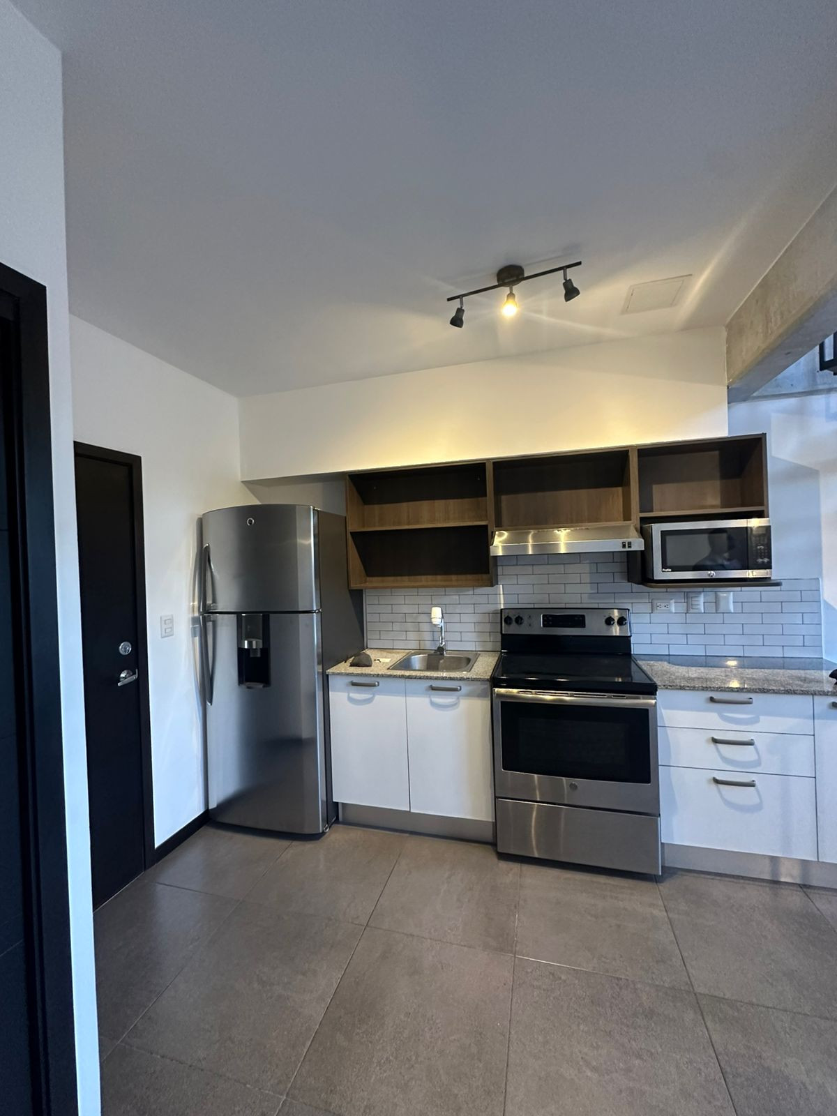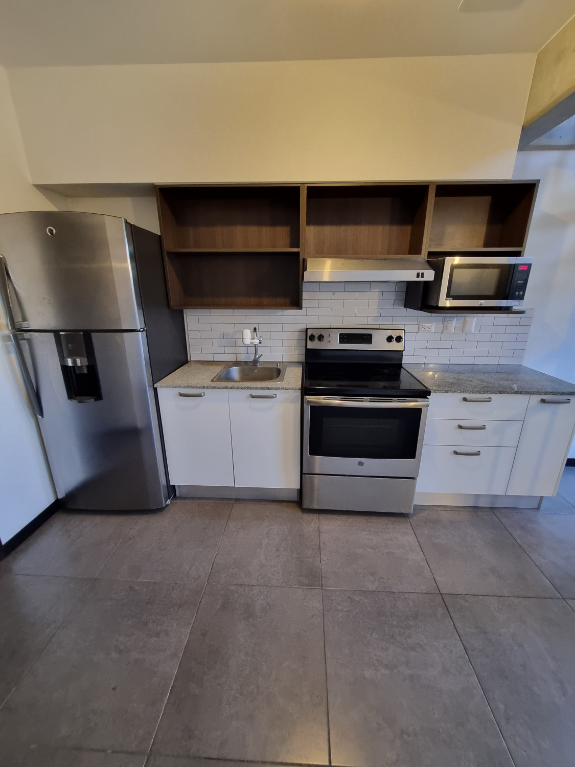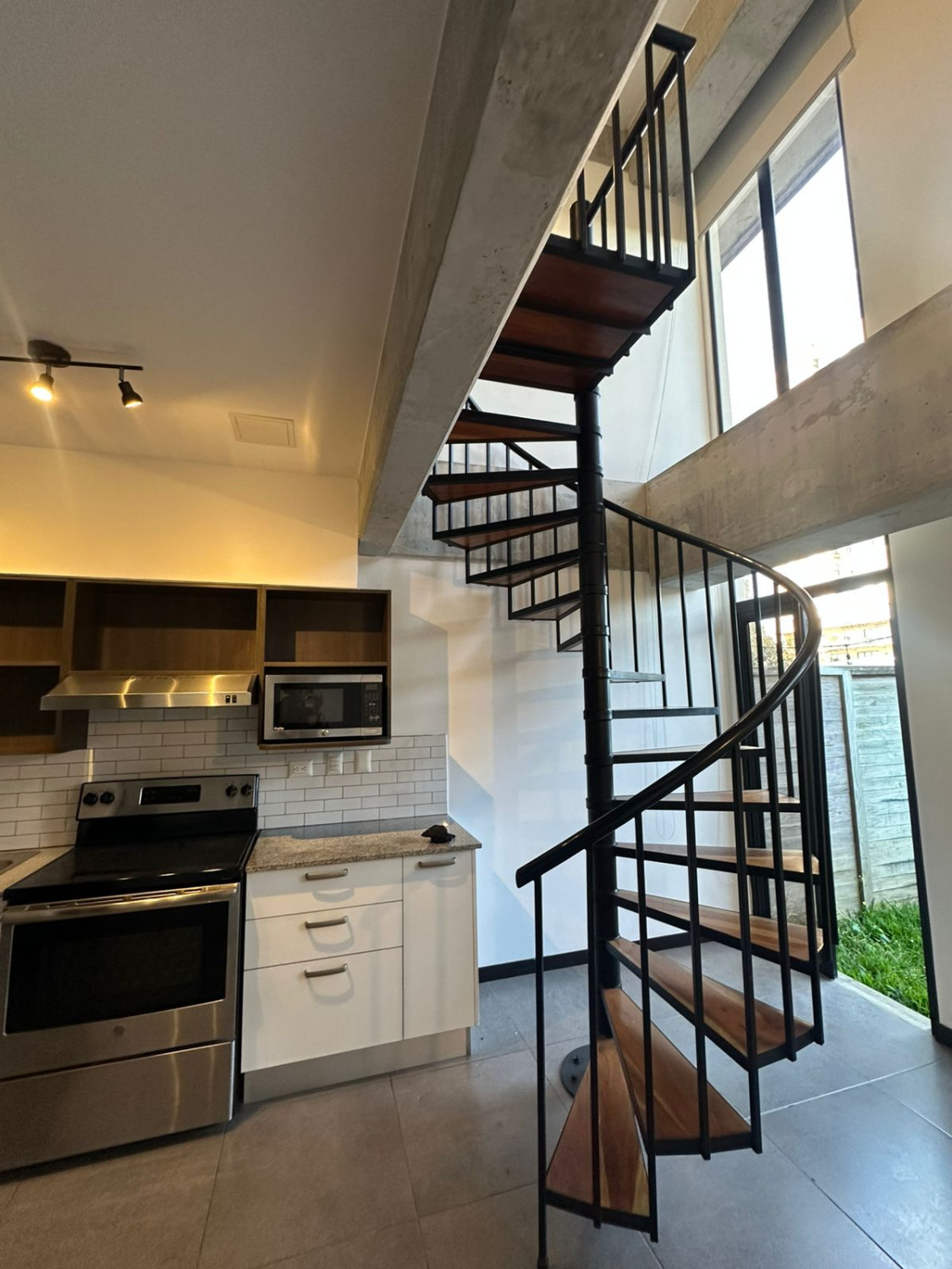 diseño moderno, cocina con top de cuarzo, piso cerámico imitación madera y zócalo de madera en todo el espacio, brindando una estética cálida y sofisticada. Dispone de línea blanca completa, desayunador.