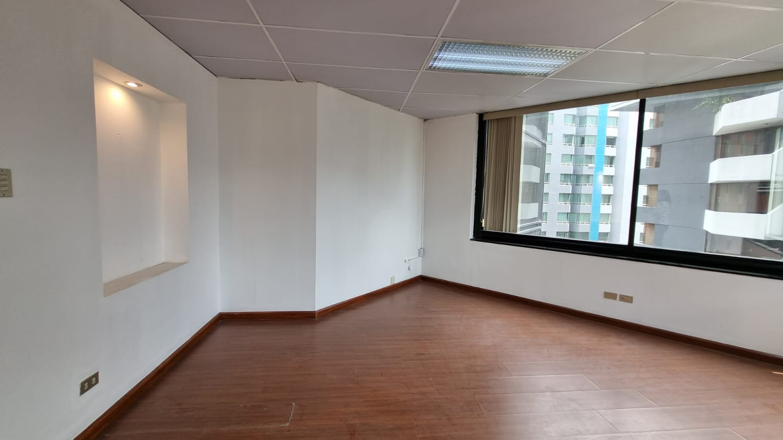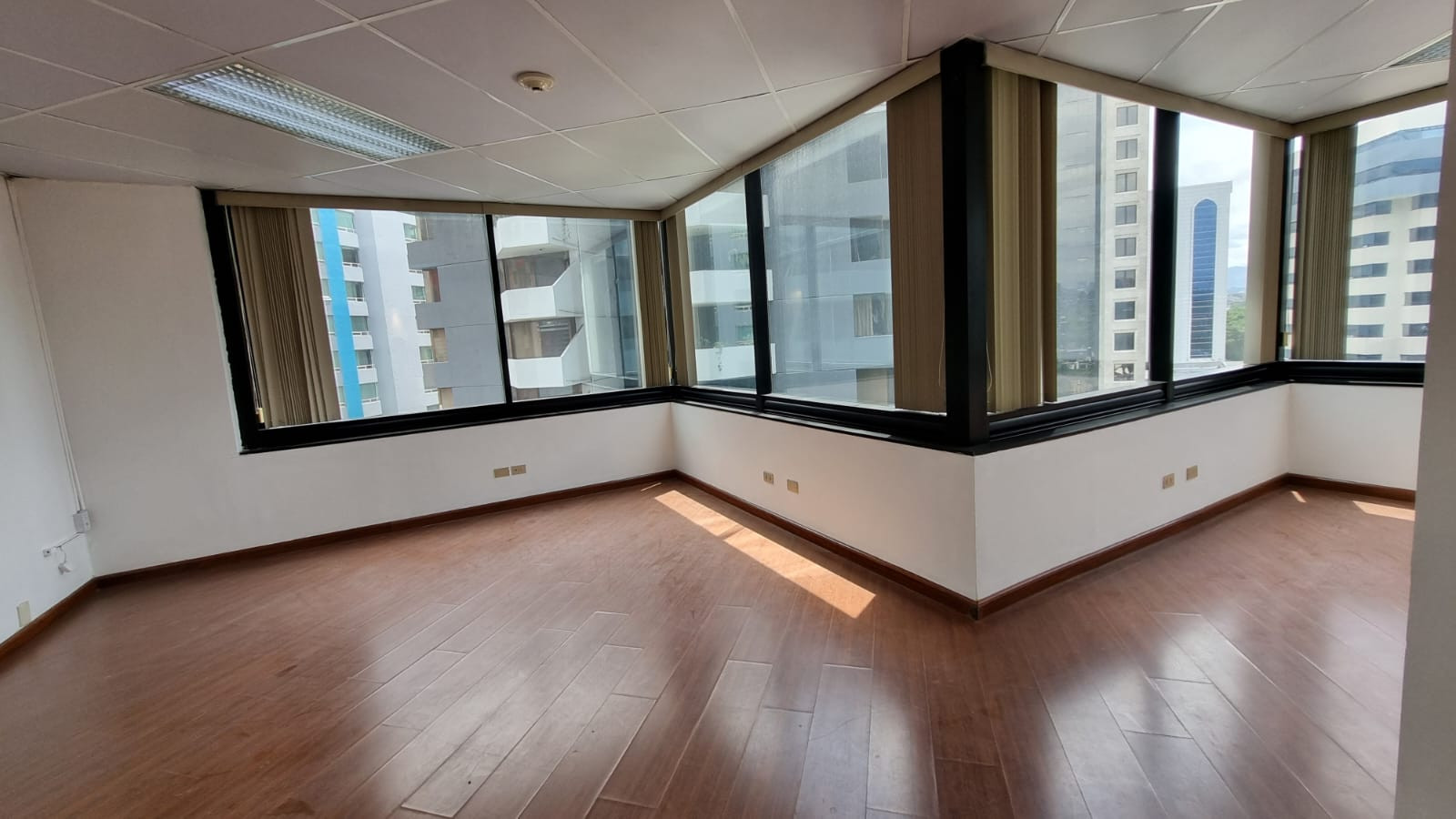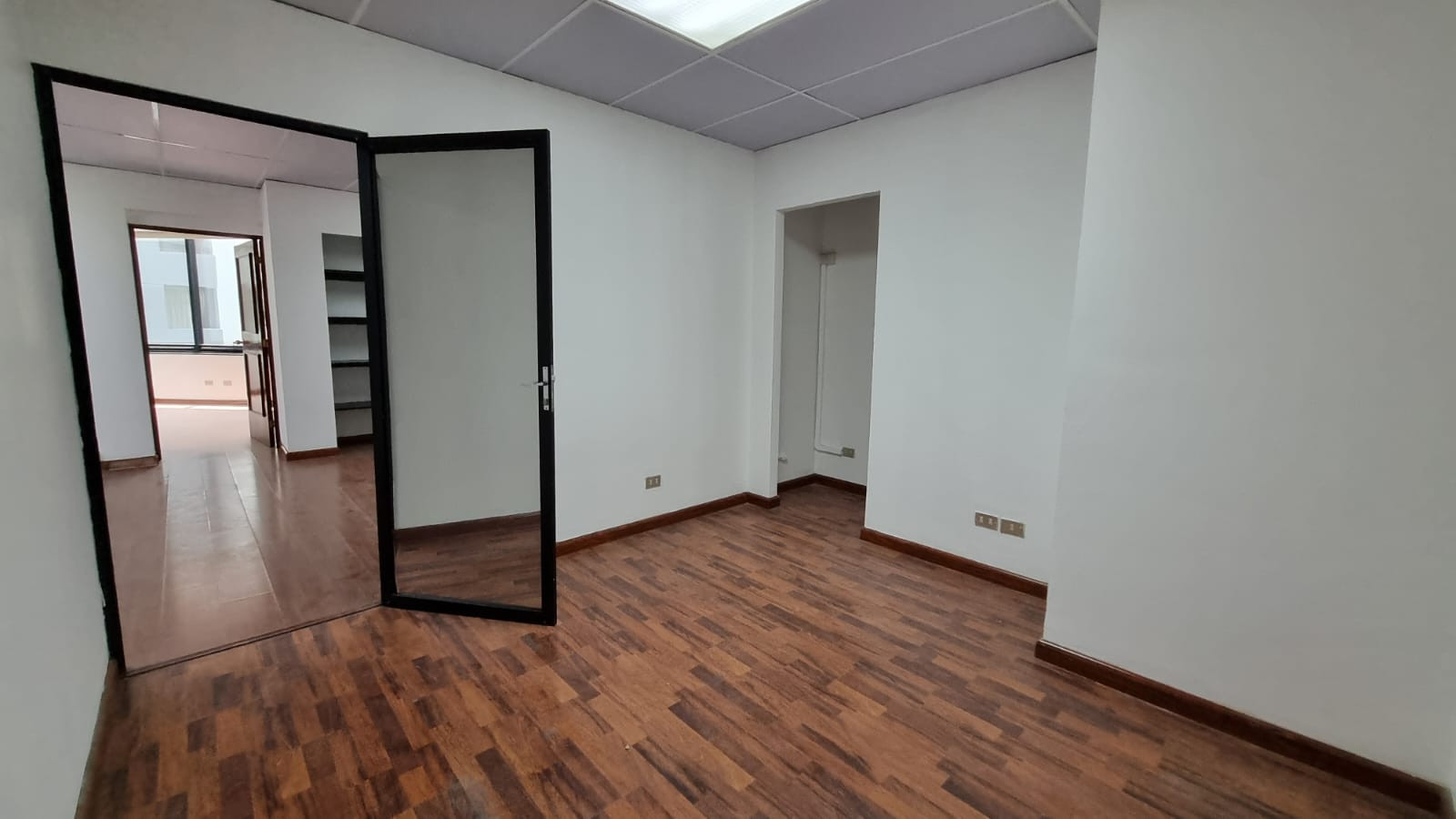 Oficina de 85m², ubicada en nivel alto, acabados en madera y vidrio, ambientes amplios.