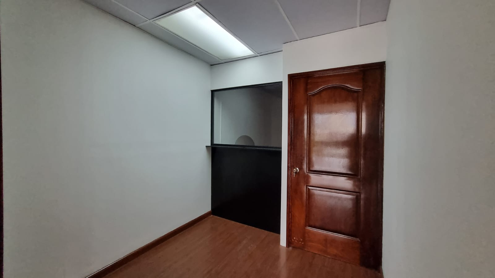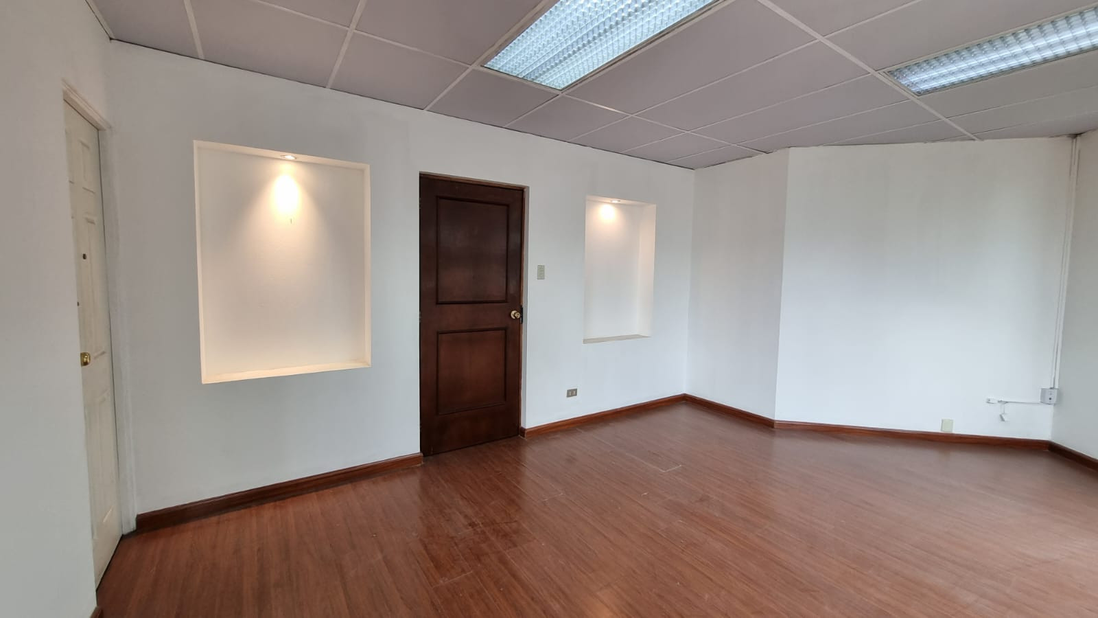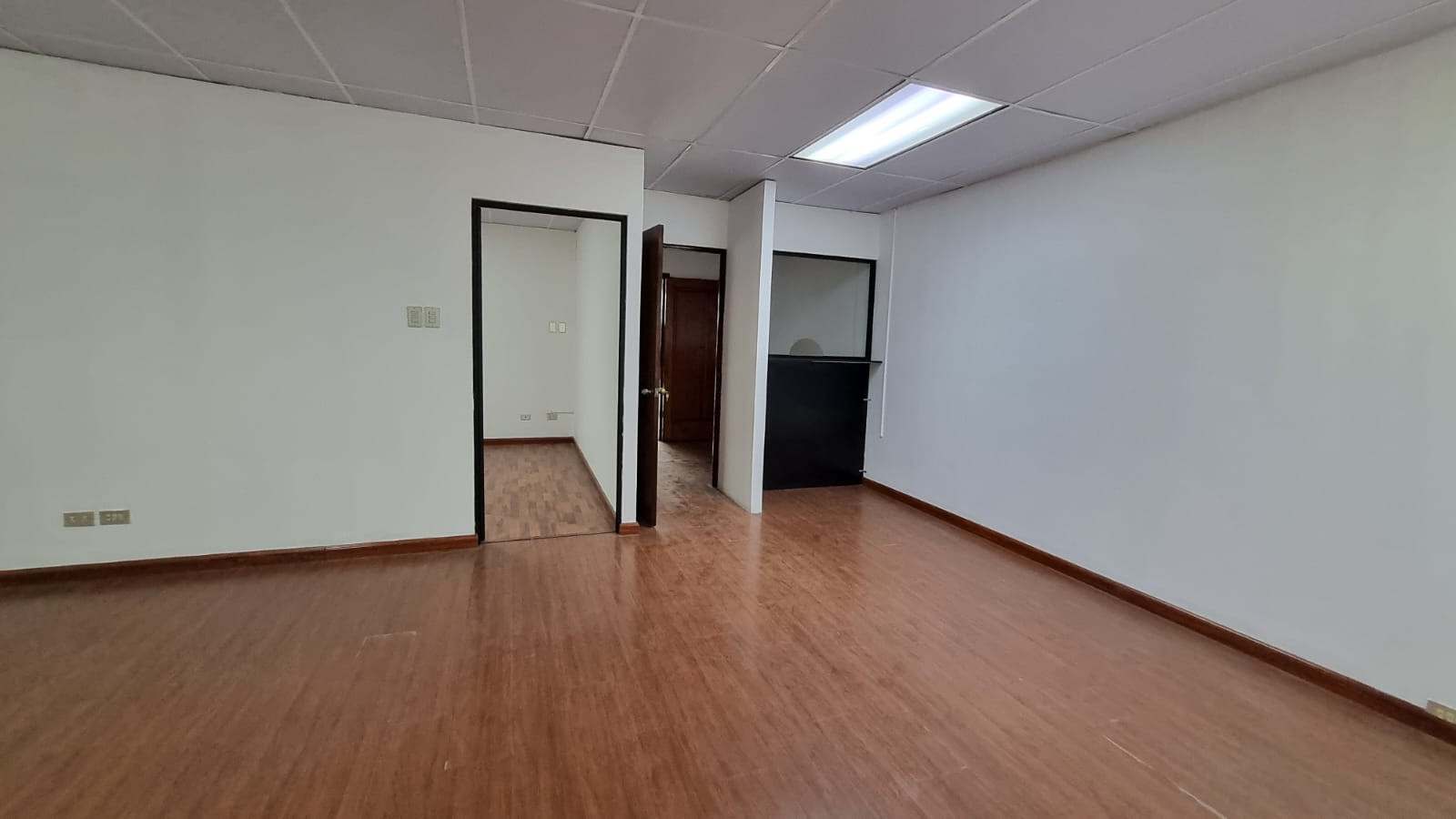 Oficina de 85m², ubicada en nivel alto, acabados en madera y vidrio, ambientes amplios.